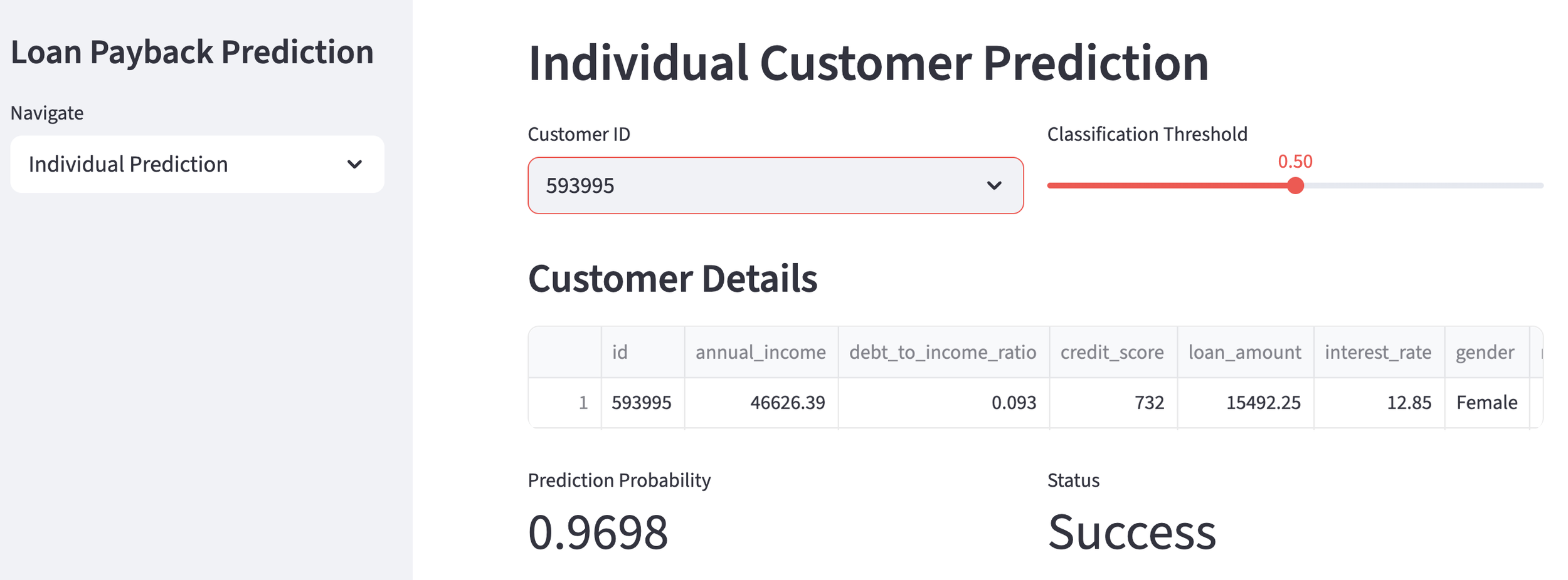 Let’s look at the model built via Agent Skills in action. First, we calculate the probability of repayment for an individual customer. In this example, the probability exceeds 96%, resulting in a "Success" (likely to repay) classification based on a 50% threshold. This threshold is, of course, adjustable depending on the specific business objectives.