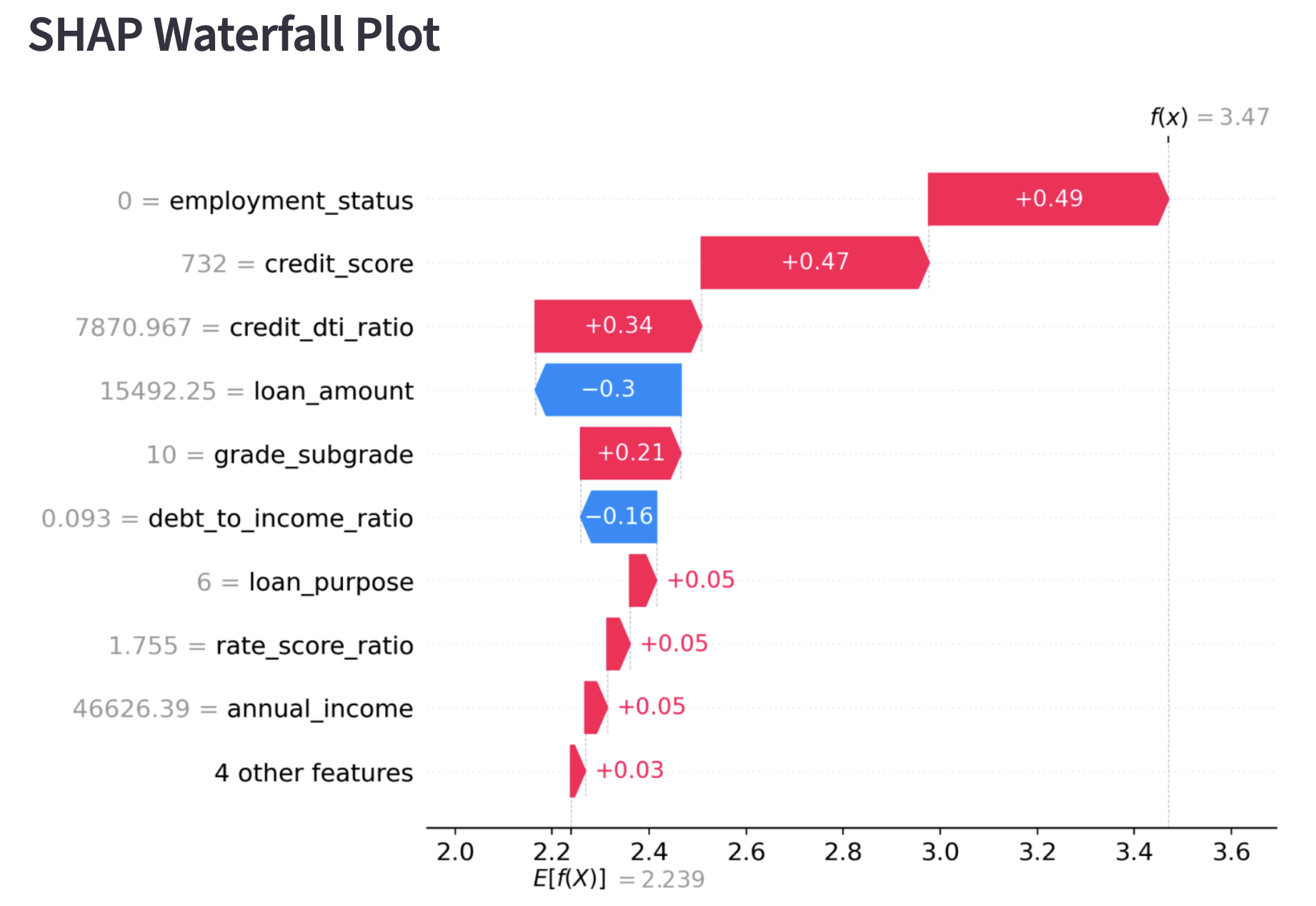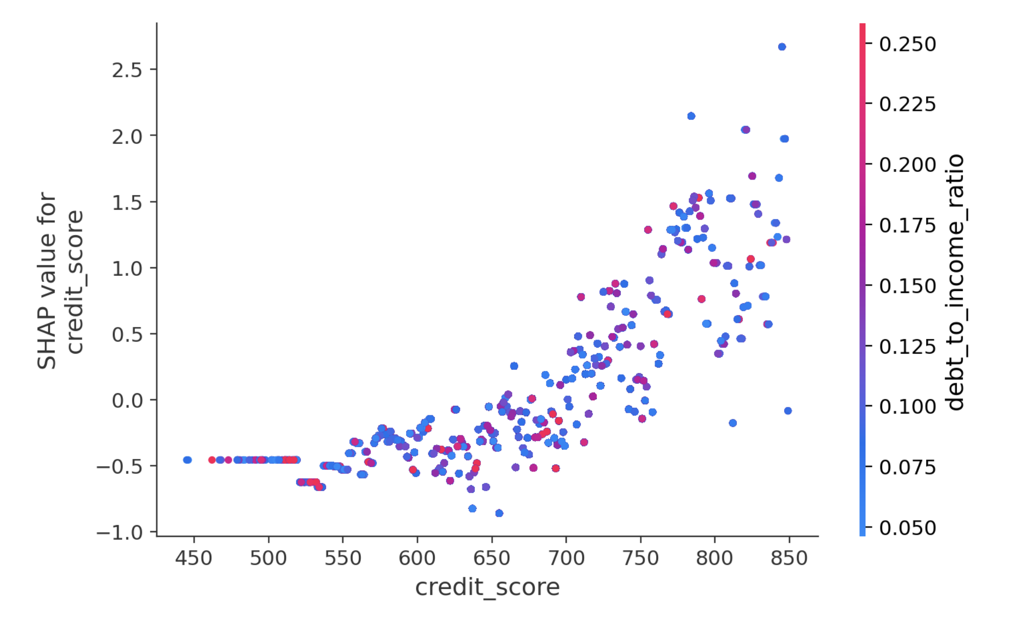 Furthermore, SHAP allows us to visualize the non-linear relationship between specific features and repayment probability. For example, with credit_score, the probability doesn't just rise linearly. The data shows that the probability remains flat until a score of 550, starts to rise at 600, and accelerates significantly after 700. This level of granular insight is what makes SHAP so valuable.