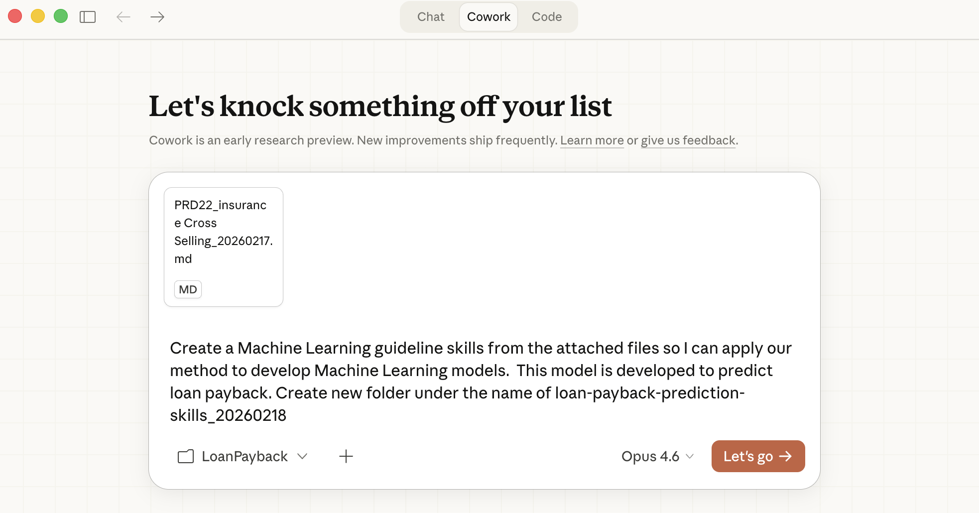 Now, let's dive right in. I’m going to create an 'Agent Skill' using Claude Cowork. I uploaded the PRD (Product Requirements Document) I typically use for building prediction models and input the following prompt.