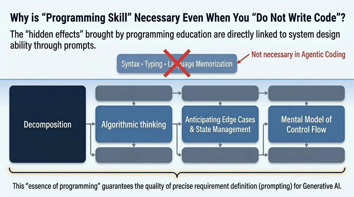 Based on our discussion so far, I'd like to explore a new approach on "how people with no programming experience can become excellent agentic coders." As agentic coding becomes more widespread, it might be inevitable that the incentive to learn traditional programming will fade. However, the following skills are still absolutely essential for mastering agentic coding: